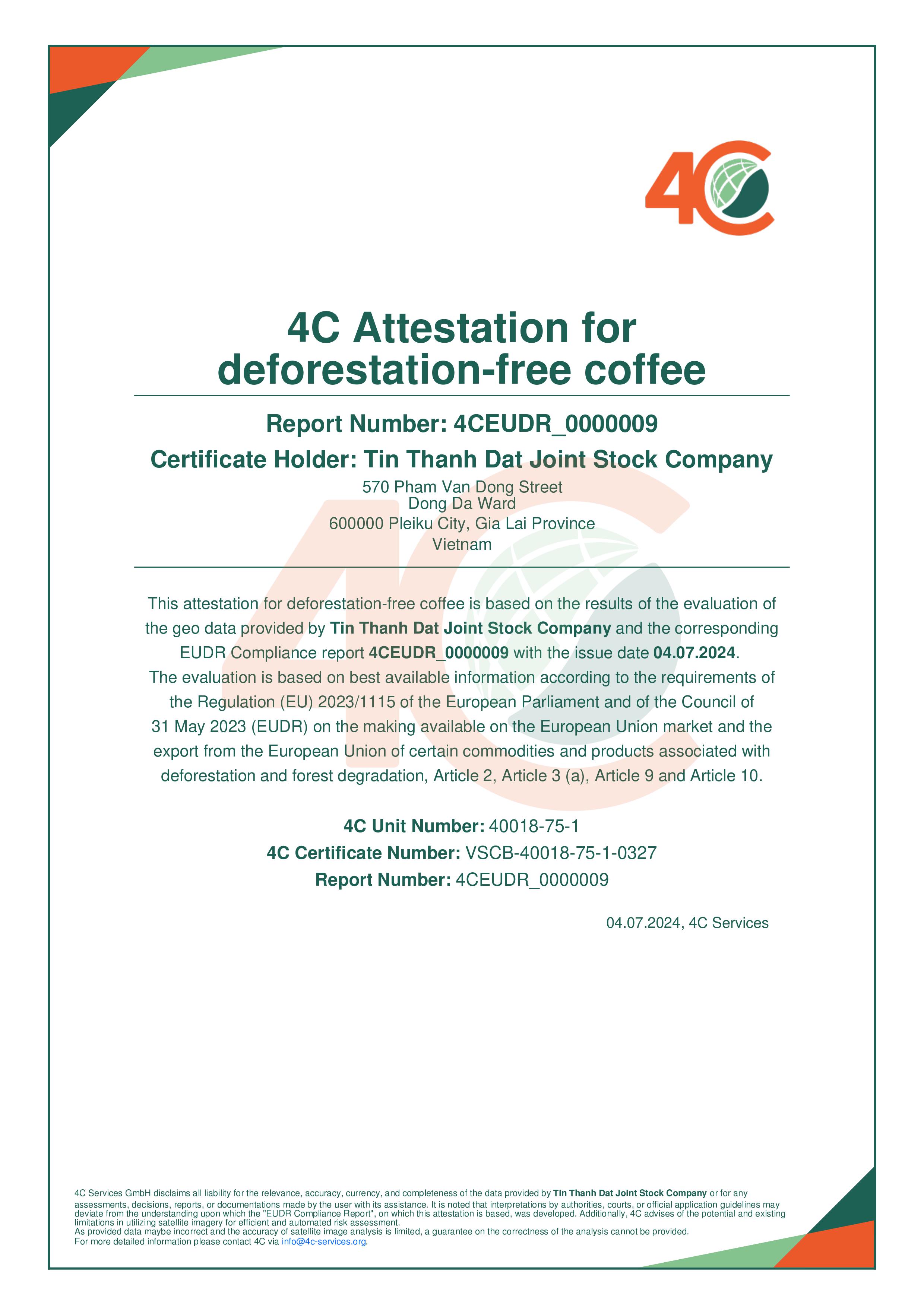 - Hợp tác chiến lược: Trong suốt hành trình chinh phục chứng nhận EUDR, chúng tôi vinh dự được hợp tác và nhận được sự hỗ trợ nhiệt tình từ tổ chức 4C - một tổ chức phi chính phủ uy tín hoạt động trong lĩnh vực phát triển bền vững chuỗi cung ứng cà phê.